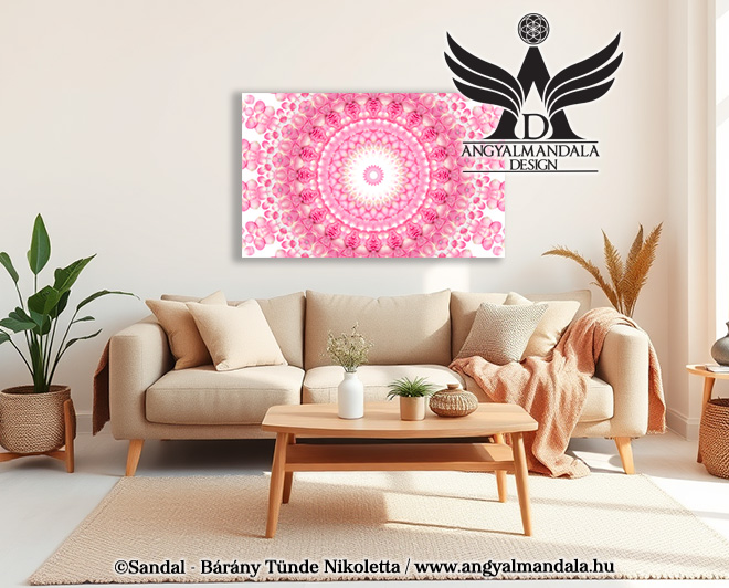 A mandalában található rózsaszín szín a feltétel nélküli szeretet, a gyógyulás és az érzelmi megújulás szimbóluma. Ez a szín elősegíti a szívnyitást és a mélyebb érzelmi kapcsolatok kialakítását. A fehér szín pedig a tisztaságot, a spirituális fényt és az angyali jelenlétet képviseli, mely segít egyensúlyba hozni az energiákat és megtisztítani az érzelmi tereket.